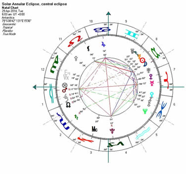 Annular Solar Eclipse Solar eclipses are creation events. When the Moon's shadow is swiping past Earth it likewise inserts a surgical cut, allowing for a new graft to be planted. This Annular Solar eclipse occurred at the Moon's descending node in Taurus. South node eclipses bring our focus to unresolved issues, asking us to tie up loose ends. We do best following through with what we started earlier, diligently striving towards the accomplishment of important projects. After 20 partial eclipses, the April 29 Solar eclipse is the first annular one of this Saros cycle (#148) which was initiated in 1653. There are quite a few unusual features to this eclipse: Its annular phase was very short, only lasting for six minutes, and only visible from a very remote location of Antarctica. No longer than six minutes the entire silhouette of the Moon was within the Solar disk, producing a ring of fire. Considering that most eclipses leave shadow corridors of thousands of miles behind, this one literally punctured Earth, making the eclipse's impact sharp and concise.